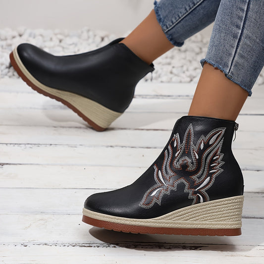 Chique dames enkellaarzen | Borduursel, vierkante neus, dikke hak, instap cowboystijl in fluweel & denim