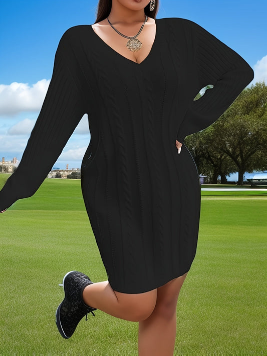 Lotte | Effen kabelgebreide trui-jurk met lange mouw en V-hals