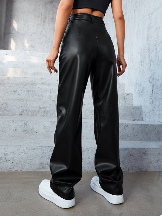 Evelien | Effen kleur kunstleren broek met hoge taille en rechte pijp
