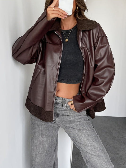 Emma | Stijlvolle PU leren rits-up jas met imitatiebont voering