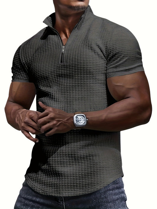 Luuk | Effen geruite gebreide zomertrui met staande kraag en korte mouw